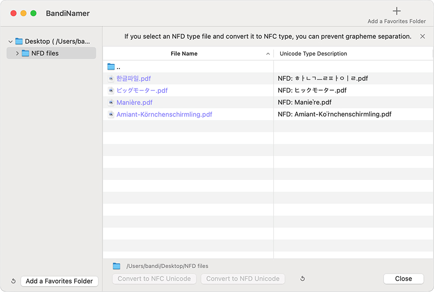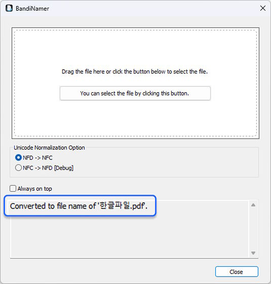 Hangeul filenames created on macOS may have their consonants and vowels detached from each other if the files are transferred to Windows. BandiNamer can prevent this problem by changing the forms of text representation of Unicode filenames to NFC.