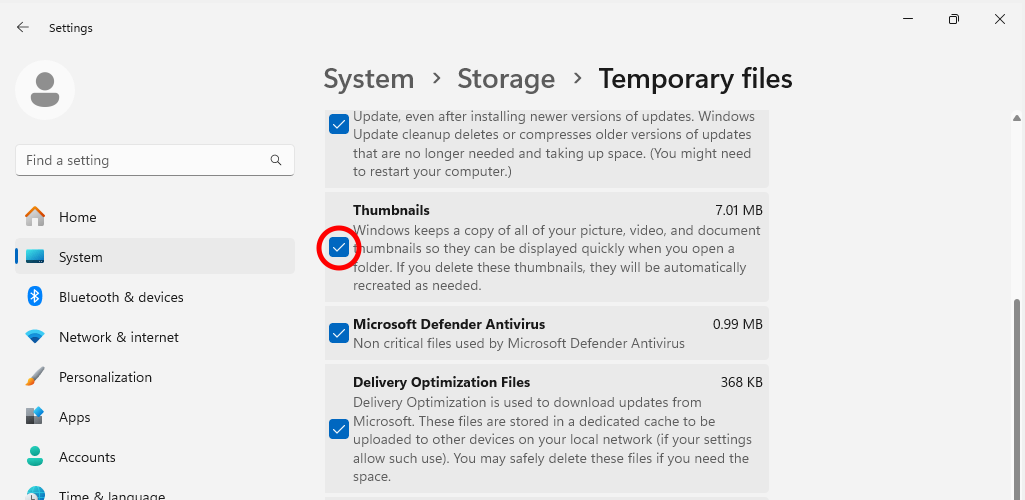 - Go to Windows Settings > System > Storage > Temporary files, and delete Thumbnails to clear the thumbnail cache.