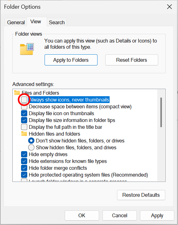 - In Folder Options of File Explorer, disable "Always show icons, never thumbnails."