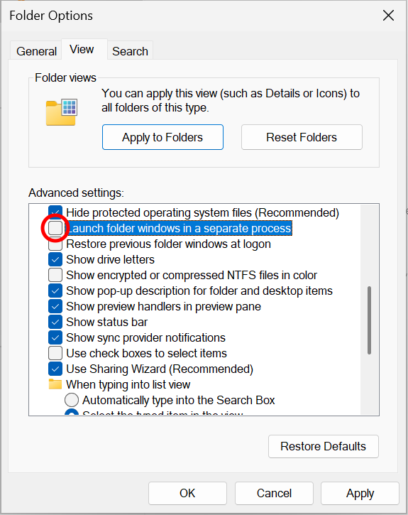 - Also in Folder Options, disable "Launch folder windows in a separate precess."
