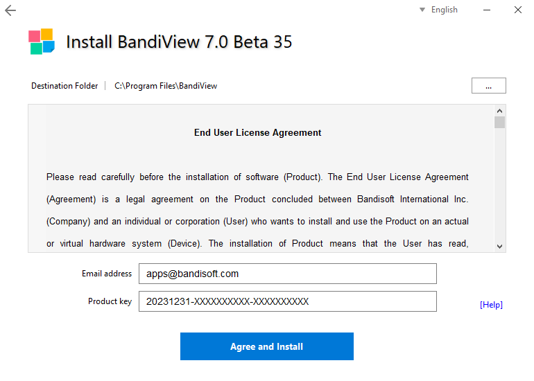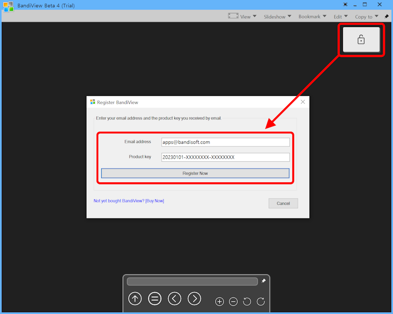 After purchasing a license for BandiView Professional Edition, submit your email address and the product key you received by email as shown in the screenshots.