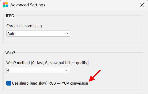 Using the YUV formats can result in a slight loss of image quality. To mitigate this issue, the image converter of BandiView offers the Sharp YUV conversion option.