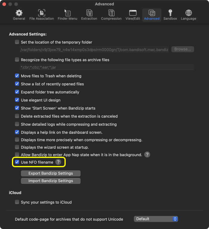 Starting with version 7.20, Bandizip for macOS provides the function to use NFD filenames when writing files do disk.