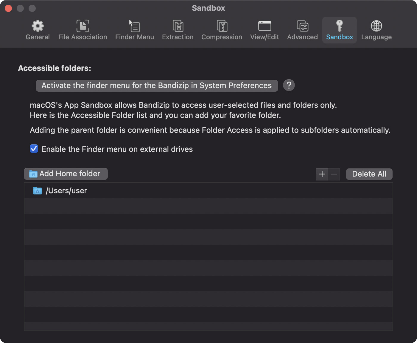 - In Bandizip’s Preferences, add your folder(s) to use the right-click menu to the accessible folders list.