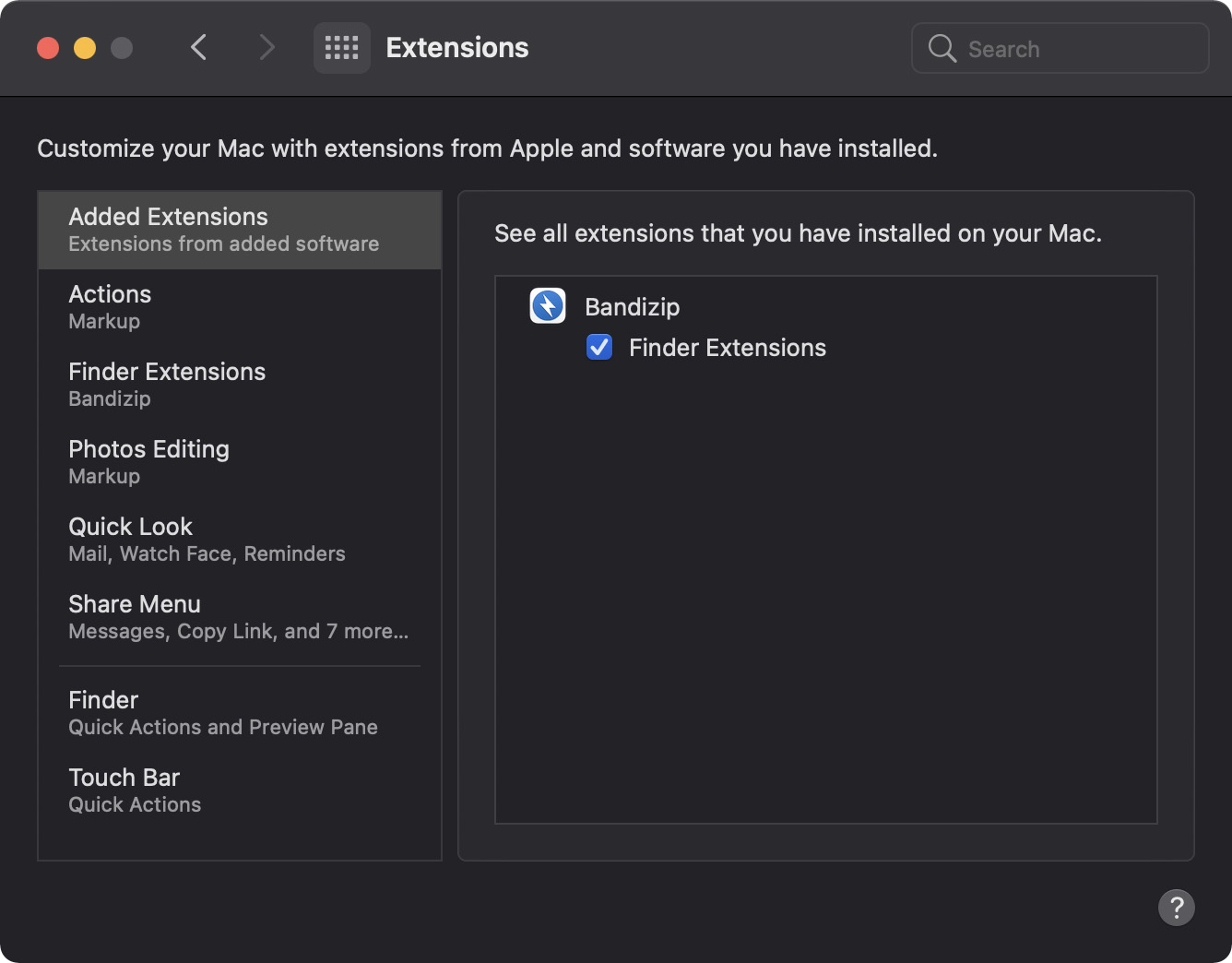 - In System Preferences > Extensions, select “Finder Extensions” and check “Bandizip Finder Extension.”