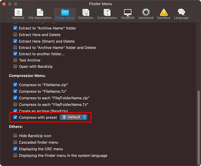 Bandizip offers you a preset function which allows you to save the current compression settings and to load them later when compressing other files. You can save not only a settings about the archive format, but also advanced settings about the password, split volume size and others in presets.