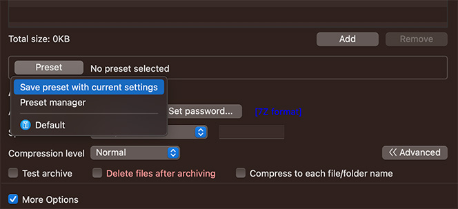 When creating a new archive, select Preset > Save preset with current settings to save the settings you have configured now as a new preset. If your preset includes a password, you can also set another master password for the preset to prevent the password being exposed.