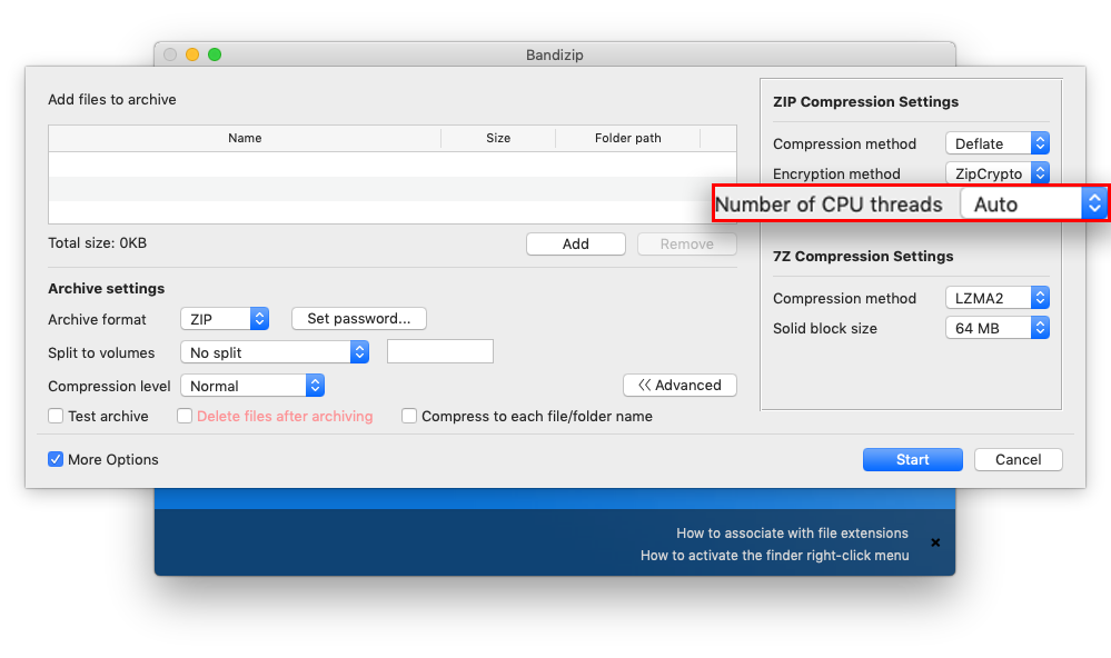 The pictures below show the comparison between Bandizip that supports multi-core and Mac Finder that only uses single-core.