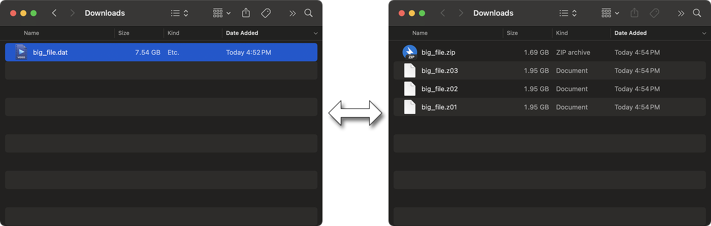 Split-archiving the original file makes several files whose filenames are followed by ZIP, Z01, Z02, etc. The receipient of the file can download all the files to the same folder and then decompress them with Bandizip to restore the original file.