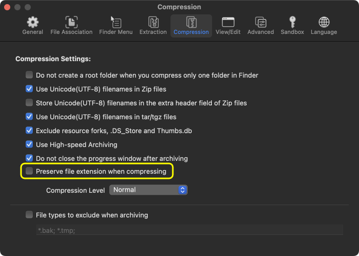 When you compress files with Bandizip for macOS, enable the "Preserve file extension when compressing" option to preserve the file extensions even in the name of the created archives.