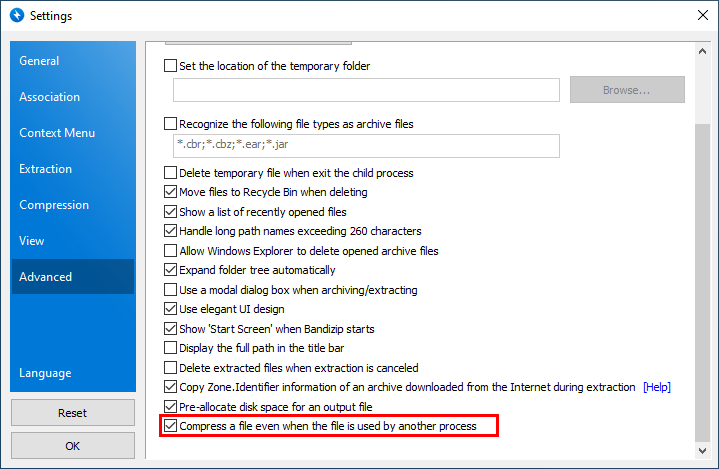 If the feature is not needed, toggle off “Compress a file even when the file is used by another process” in the advanced settings as below.