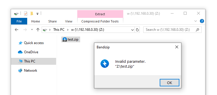 This error occurs when you run Bandizip as an administrator and the File Explorer in standard user mode cannot access your network drive.