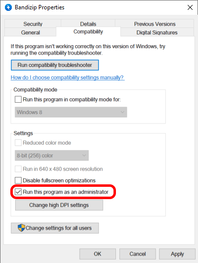 - If Bandizip is still running in an administrator mode due to other causes, remove the causes and run Bandizip as a standard user.