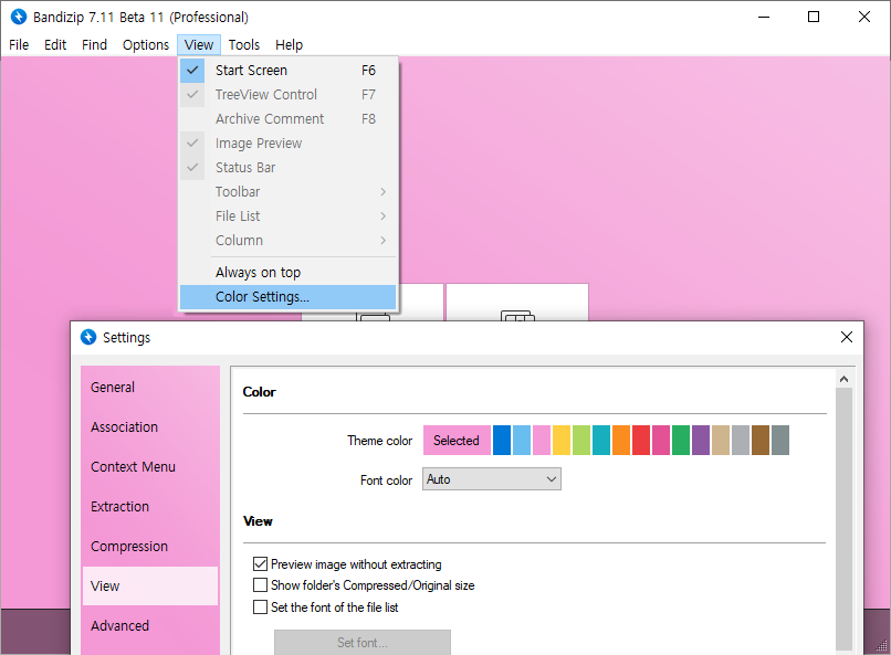 Bandizip (6.0 and later) provides the feature allowing you to change the theme color for the program.