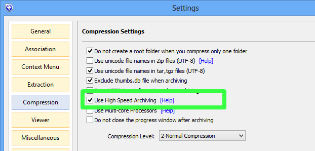 “High-speed Archiving” comes from this, and when it is determined that a file is no longer compressible, the feature aborts the compression attempt and skips the file. As a result, the compression speed is improved.