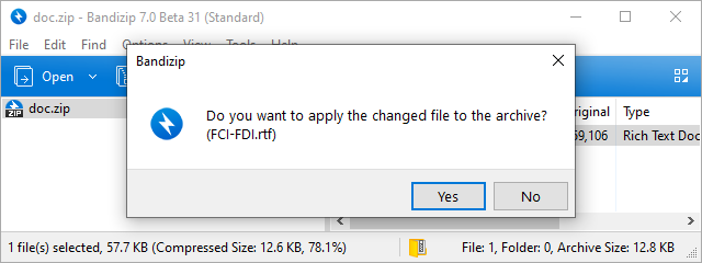 You may edit the file, save it, and exit the editor. Bandizip will detect modification of the archive’s content and display the message as below.