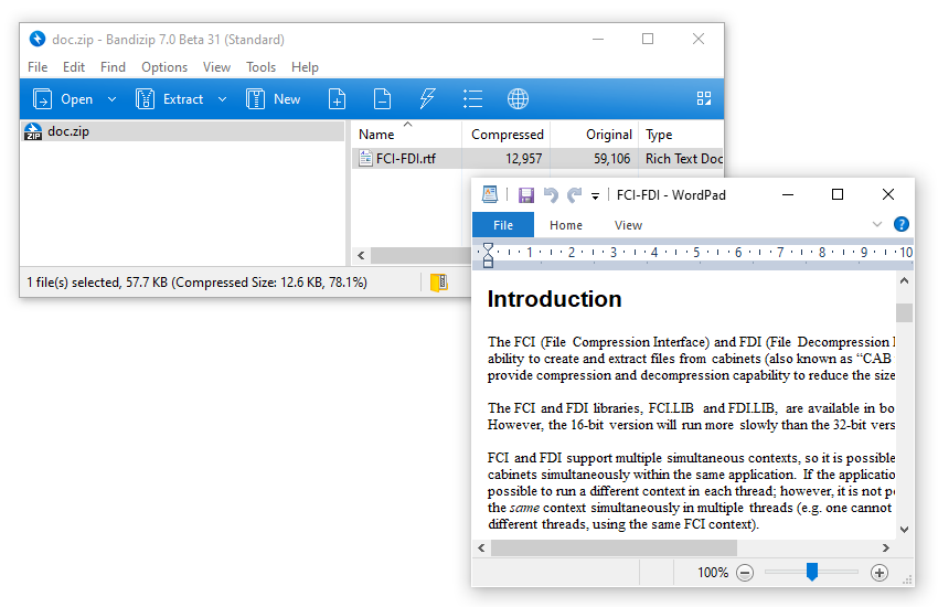 When a document file is archived in your ZIP archive, you may open the file directly in the archive. Bandizip will extract the file to the temporary folder, and open it using an editor software (such as WordPad or MS Word) associated with the file type.