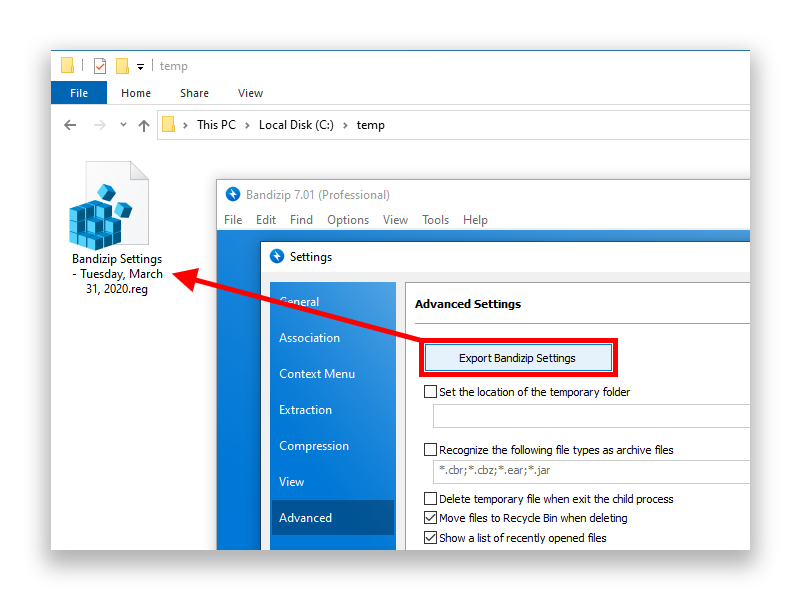 - In the Advanced Settings of Bandizip, click Export Bandizip Settings. Specify a destination folder to export the settings, and Bandizip creates a file with the extension REG in the destination folder as shown below.