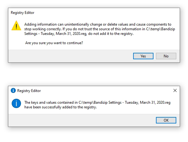 - Open the REG file, and click Yes or OK when the following dialog boxes are displayed. Run Bandizip and you can find that the settings which you exported before are fully applied.