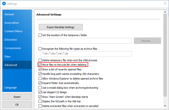 With this feature toggled on, Bandizip moves files to Recycle Bin (Trash if you use macOS) when it deletes them in the following situations: