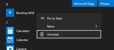 Open the Start menu and find Bandizip MSE. Right-click the app icon and select Uninstall.