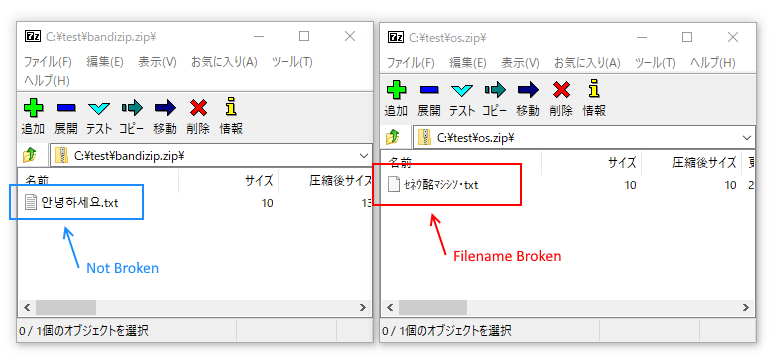 The picture below shows the difference between using the feature and not using it when sending a ZIP file compressed on Korean OS to Japanese OS.