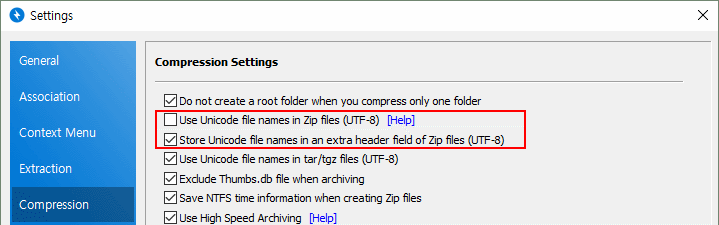Bandizip stores additional UTF-8 filenames in an extra header field of ZIP format, while storing the original ones in MBCS. This method is also defined by APPNOTE as “Info-ZIP Unicode Path Extra Field.” Because it uses the extra field to store the UTF-8 filenames, the file sizes would be tens of bytes larger than the former ones. However the original filenames are stored in MBCS, and therefore the files are safer and more compatible.