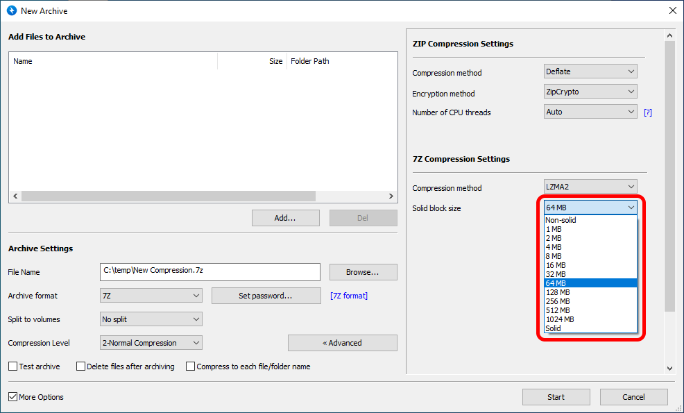Bandizip supports specifying the solid block size of 7Z format as below.