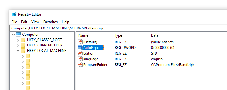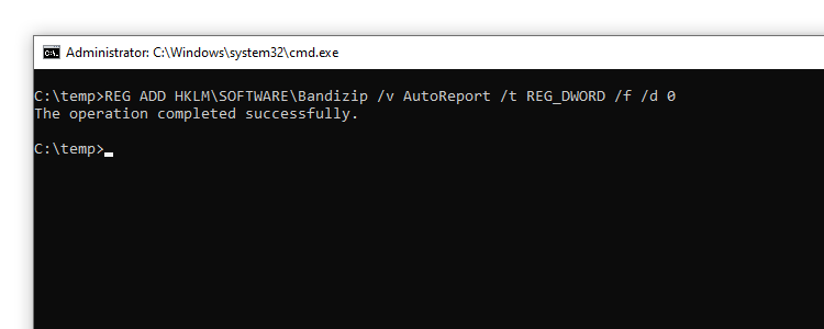 REG ADD HKLM\SOFTWARE\Bandizip /v AutoReport /t REG_DWORD /f /d 0