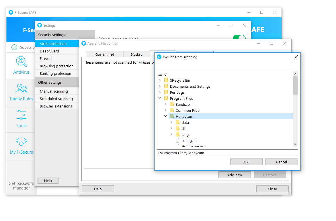 To solve the problem, exclude Honeycam from the scanning of F-Secure SAFE as follows: