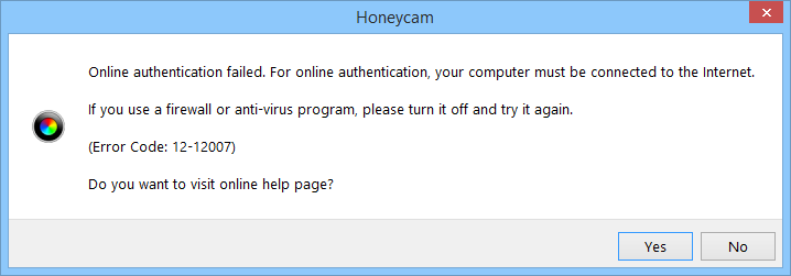 On the first run of Honeycam, if your PC has no connection to the Internet, an error message is displayed as below.