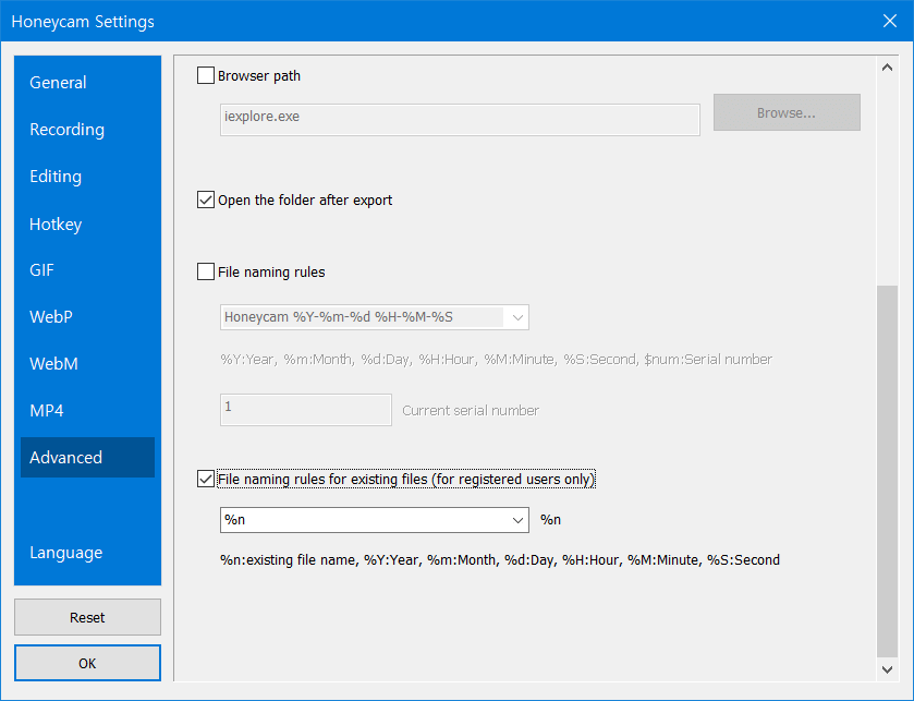 Honeycam Settings(F5) > Advanced Please turn on the option [File naming rules for current files] and select %n in the selection box. Then click OK in the left bottom. It's done.