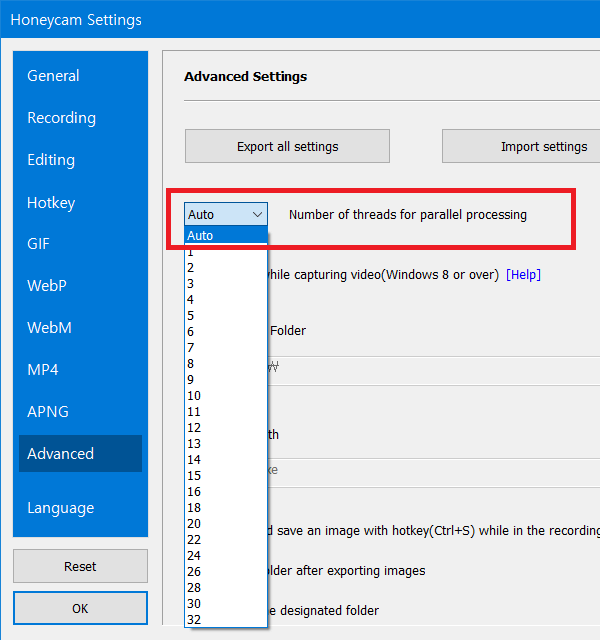 In such cases, there is a way to reduce the CPU usage in Honeycam. You can lower the "Number of Threads Used for Parallel Processing" in the advanced settings of the configuration. If this is set to Auto (the default setting), it will use all available threads.