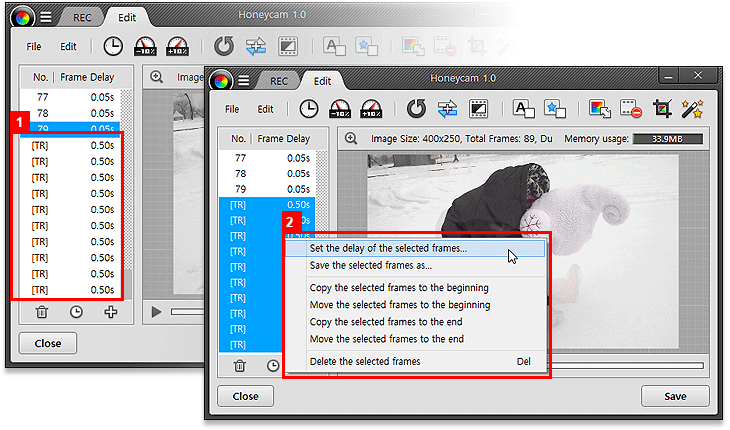 - As you do for the other frames, you may adjust the frame delays or delete the frames to change the transition type if you aren’t satisfied with the type of the existing one.
