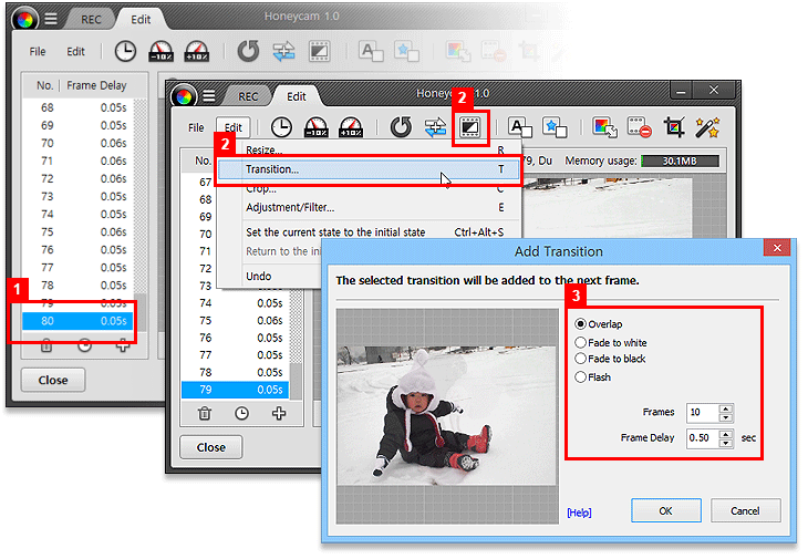 Honeycam provides a Transition feature that makes your animated file repeat (loop) more naturally by adding an effect of a connection between the last frame and the first frame of the animation.