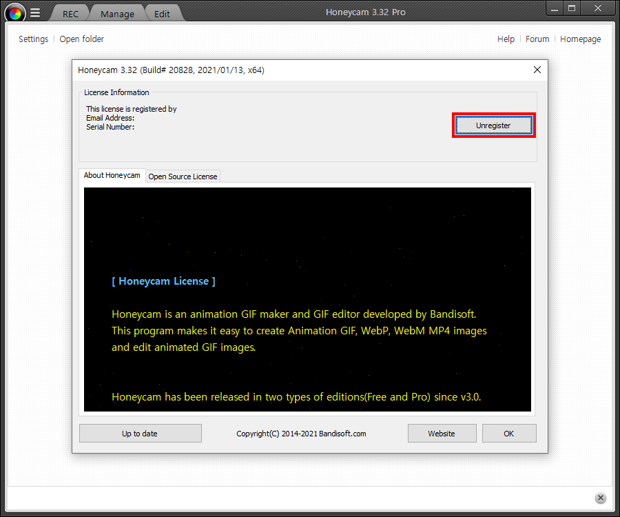 - Run Honeycam. Press F1 key to open the About window, and then click the Unregister on the right side.