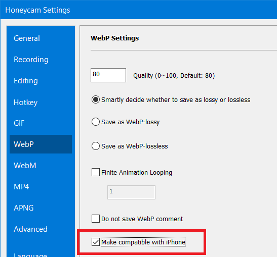 Just check the option [Make compatible with iPhone] on WebP settings in Honeycam Settings (Hotkey: F5). Actually, this option is the default setting so you don't have to touch anything. In case, your Honeycam doesn't show this option, please update Honeycam to the latest version.