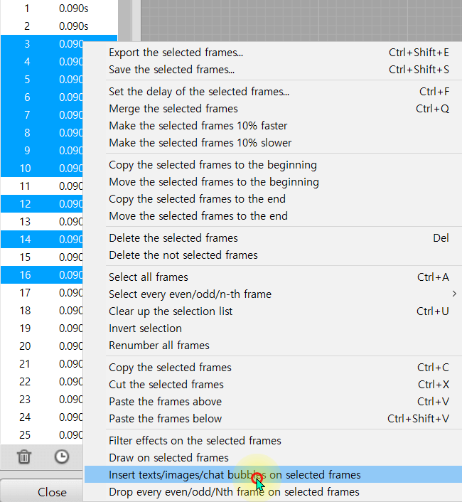 4. Right-click on the selected frames to apply effects/add texts. Or you can click on the toolbars.