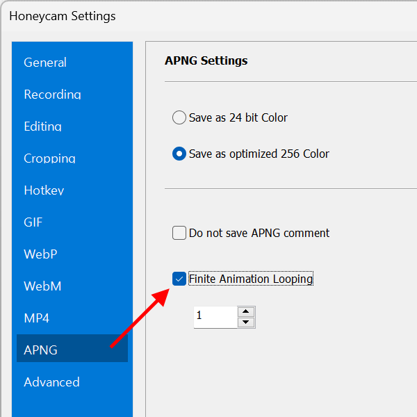 Go to Settings (F5) > APNG tab. Enable "Finite Animation Looping" and select a value between 1 and 4.