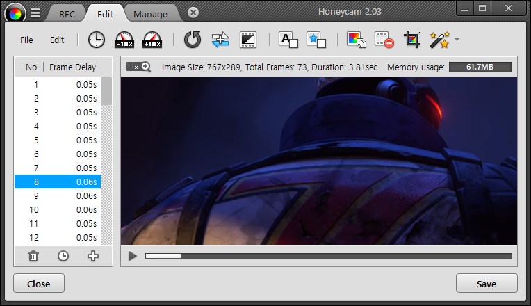 Although GIF is limited to 256 colors, Honeycam can create High-Quality 256 color animation through quantization.