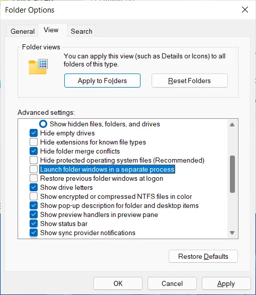 Some issues have been reported with File Explorer in Windows 11 22H2, that the context menus provided by Bandizip and other third-party apps do not work correctly. If you have such issues while using Bandizip in this version of Windows, open the Folder Options of File Explorer and uncheck "Launch folder windows in a separate process" and then try again.