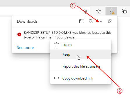 For troubleshooting, click the … button and select Keep as shown below to complete the download of the installation file.