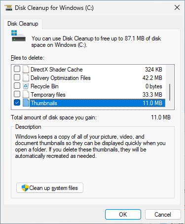 - In the Disk Cleanup, select "Thumbnails" and click OK.